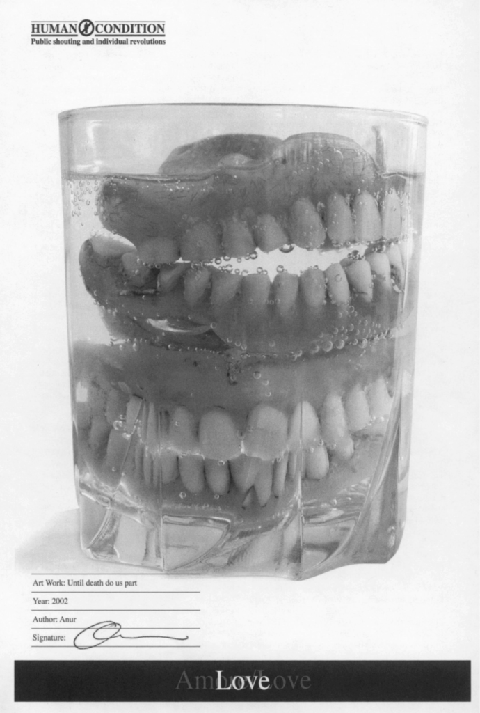 I was lucky enough to hear the back story behind this work from Anur himself, at a conference in Torino in 2009. The false teeth photographed here actually belonged to his grandparents, and they were in fact soaked together in a single glass each night. Some might perhaps find only morbidity or mortality in such an image, yet, for Anur, commingling of this sort was the expression and emblem of love. Simple and pure.