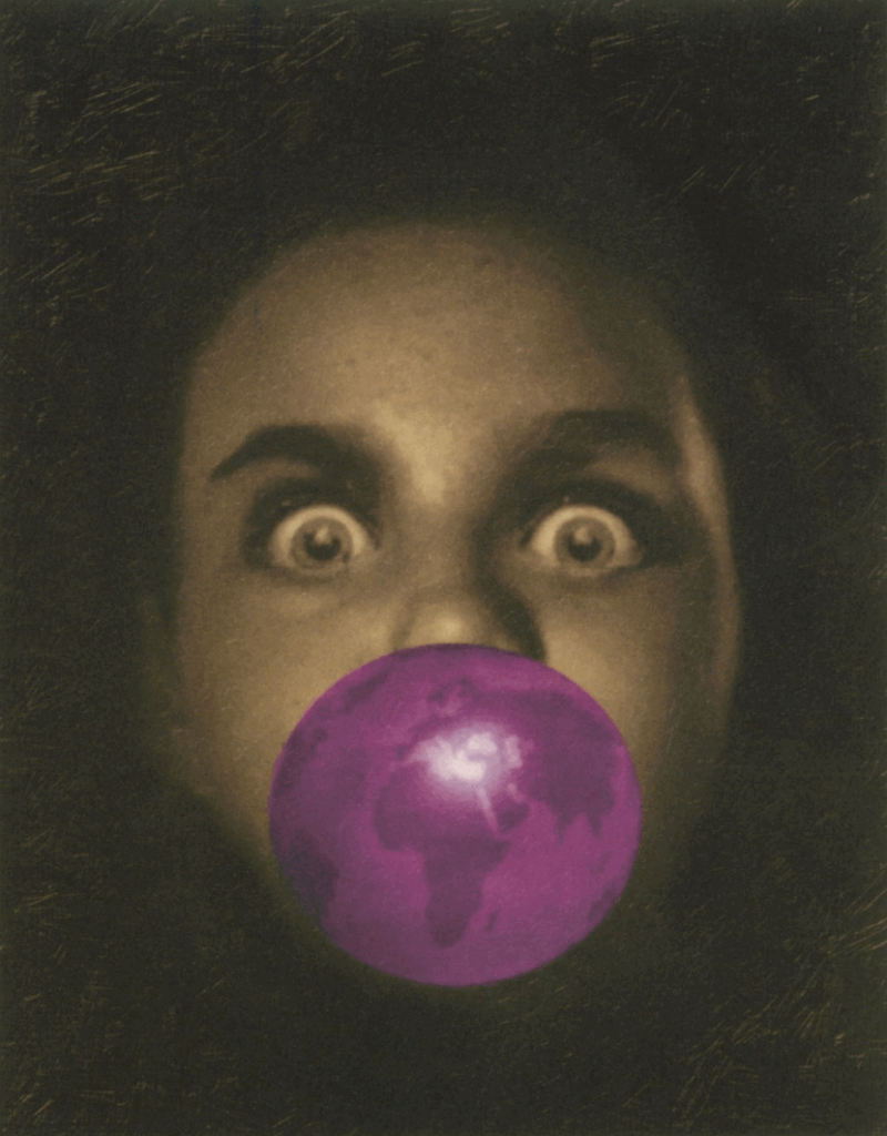 By now, I suspect that you, like me, will wonder if the wide-eyed boy in this photo is none other than Anur’s eldest. By now, I assume that you, like me, will read the look in this boy’s eyes as equal parts wonder and terror, and that you will also note the geographical placement of the gleam on his bubble—a shine that covers some of North Africa, much of the Middle East, and all of the Balkans. Could it be conflagration? For Sigmund Freud, any instance of real humor works as a spoonful of sugar: wit allows the id out, albeit clothed in mufti. Anur’s work doesn’t bother to sugarcoat; his jokes are daggers, without the cloak.