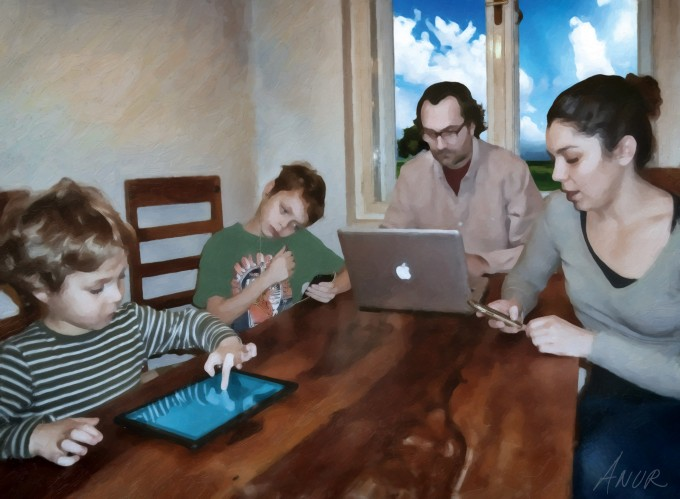 Except, of course, that it isn’t only that. This is also a sagrada familia: though the iFamily is isolated, scattered across cyberspace, they are also sitting together around a table. The lure and abyss of this image would lack all power if it weren’t for their collective presence, an ensemble that belies their collective preoccupations. The painterly manipulation of the photogram emphasizes this point; a simple photo would have seemed voyeuristic, the usual gotcha moment decrying a small clan of vidiots. As a painting, or even as the simulacrum of the painterly, the image begins to celebrate, rather than simply recoil.