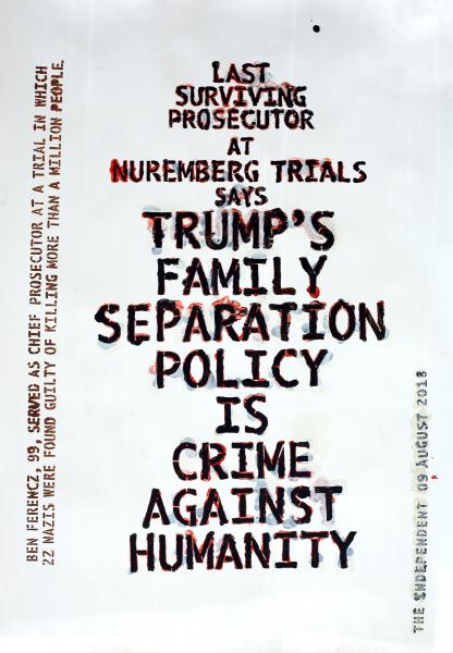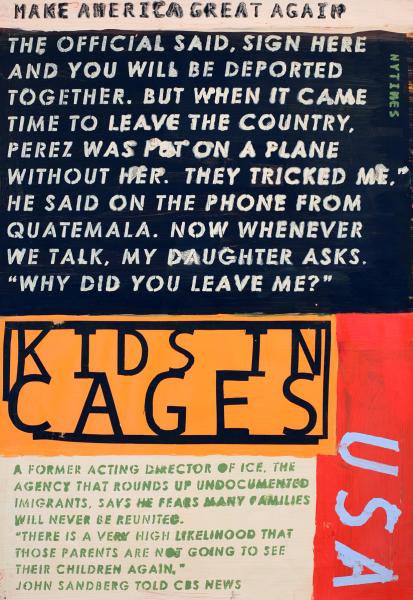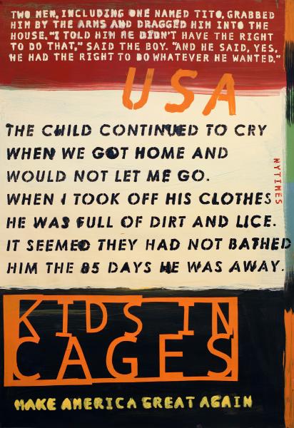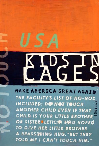 Over the last three years, many of the news items I’ve recorded in paint have seemed funny, surreal, or even unbelievable—but some were disturbingly sad: for example, Kids-in-Cages. Because of resolute news people and a few inquiring members of Congress, it was exposed that our government was imprisoning hundreds, even thousands, of families at the border. Kids were separated from their parents and housed in metal cages, living under rules like: Do not touch another child even if that child is your little brother or sister. How do you tell a three-year-old such a thing? (Taking into consideration that the workers and the children often did not even share a common language.) Because of inadequate housekeeping and care, many became sick, some died, and due to uncoordinated record-keeping, many would never be returned to their birth parents. People all over the world were horrified, and the last surviving chief prosecutor at the Nuremberg Trials labeled the program a “crime against humanity.”
