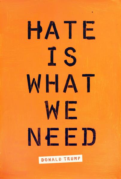 WARD SCHUMAKER is an artist known in particular for his hand-painted, one-of-a-kind books. An unintended and fortuitous viewing of one––a collection of quotes from the mouth of Donald Trump––resulted in the publication of Hate Is What We Need, available from Chronicle Books. Schumaker is represented by the Jack Fischer Gallery in San Francisco.