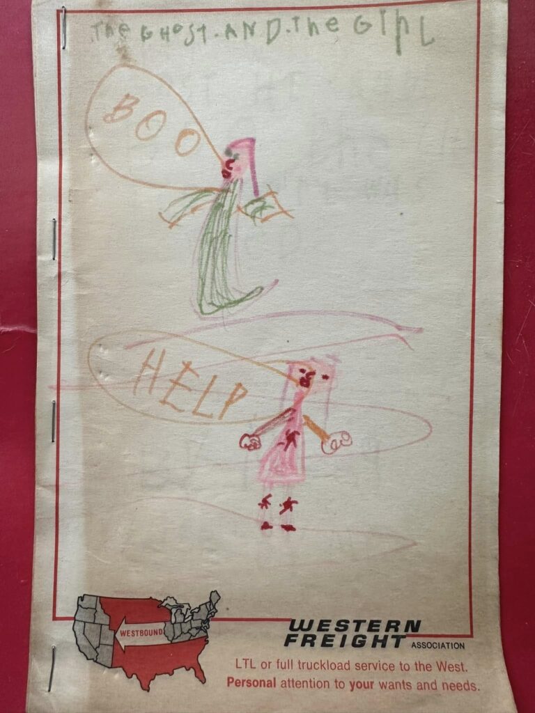 I recently came across a box of childhood belongings at my mom’s house in Cleveland and discovered the first “book” I wrote. It’s written in crayon on Western Freight Association paper, the binding held together with staples. The story is about a girl whose home is haunted by a ghost. (It’s aptly titled “The Ghost and the Girl.” I was a literal child when it came to naming; my family had a gray cat named Gray and an orange cat named Orange.) Eventually, the ghost in the story possesses various family members, and the narrative ends without much resolution. The story is pretty dark and violent—particularly so since I probably wrote it when I was about five. Strangely, though, that story predicts a lot of my current interests in both genre (horror, Gothic, speculative) and themes like family, trauma, and the unknown.