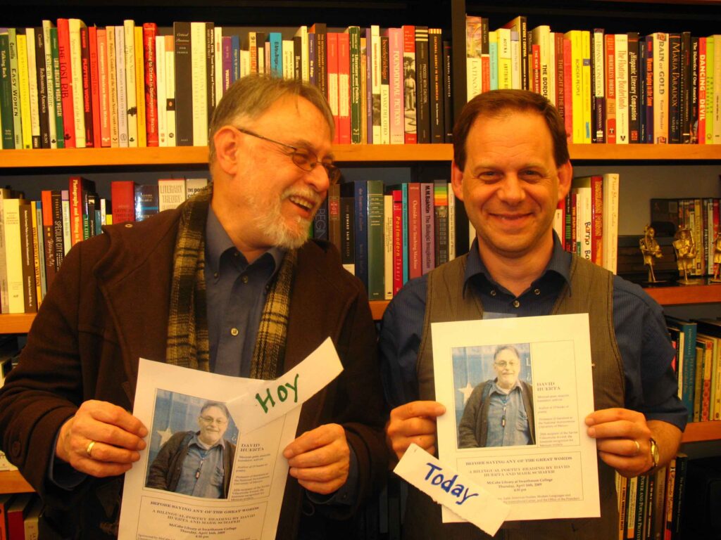 In the mid to late-1990s, the Mexican poet David Huerta reached out to me through a mutual friend to see if I’d be interested in translating a dozen new poems of his into English for an upcoming reading he was scheduled to give in California. I read them and fell in love with his poetry: his linguistic precision, his love of life in all of its rich and fascinating messiness, his commitment to language in all of its complexity and specificity, his passionate humanity. (See my “Elogio y agradecimiento a David Huerta” for more (in Spanish) of what I loved and appreciated about David.) Those translations were the beginning of an ever-deepening professional and personal relationship with David that culminated in my translated, career-spanning anthology of his poetry, Before Saying Any of the Great Words: Selected Poems (Copper Canyon Press) and my love for him as a brother.