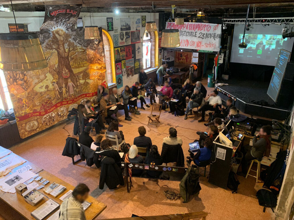 Banner دالة الشعب from People’s Justice series No. 7 as backdrop for the first congress of Art Not Genocide Alliance (ANGA), Venice, November 2024. The banner is co-produced by Taring Padi, The Kitchen, Globe Aroma, Subversive Film, Question of Funding, and Learning Palestine.