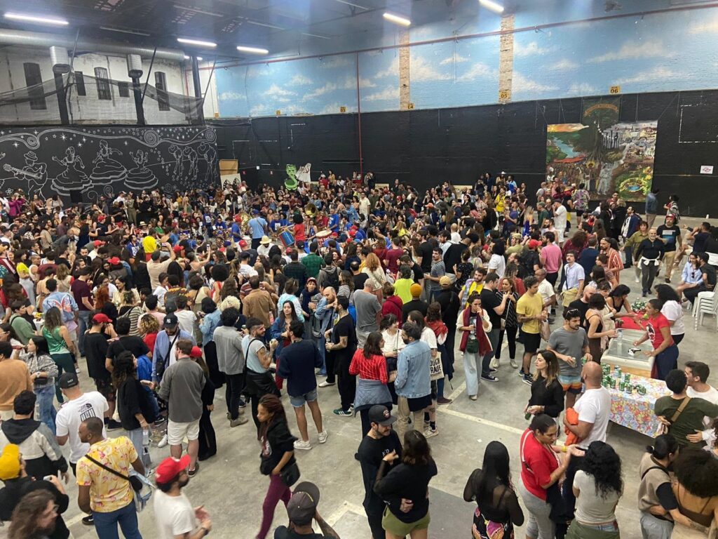 First Presentation of Retomar Nossa Terra banner from People’s Justice series No. 2 at MST space, Sao Paolo, Brazil, April 2023. The banner is co-produced by Taring Padi, MST, Casa do Povo and Framer Framed.