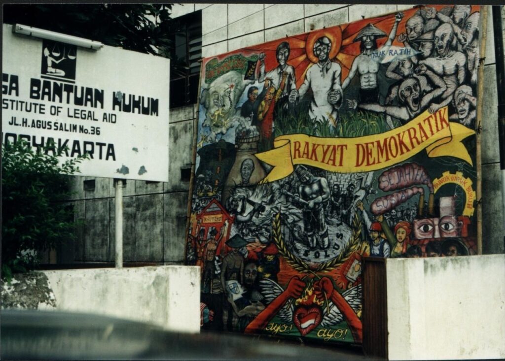 The Display of People’s Democracy banner during Taring Padi’s declaration at the Institute of Legal Aid, Yogyakarta, Indonesia, 21 December 1998.
