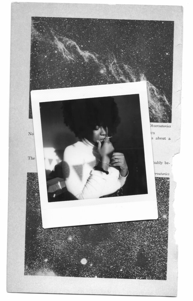 Collage featured in Erlichman’s upcoming book, Is. “Angel in Our Kitchen” (2023, polaroid, astronomy text).