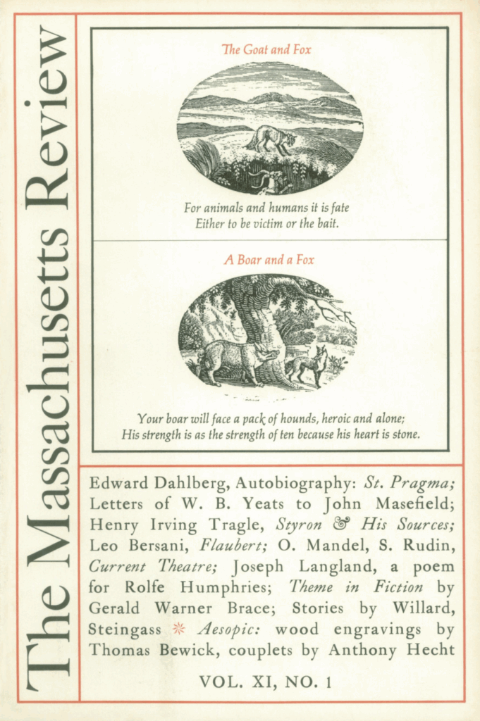 Anthony Hecht‘s “Improvisations on Aesop” appears in his most recent book of poems, The Hard Hours, published by Atheneum in 1967.