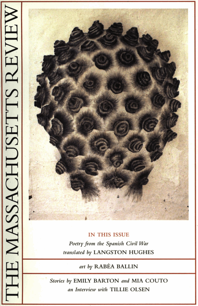 Few writers have felt so urgently the call to engage as did Tillie Olsen, whose reminiscences and ruminations are captured here in Robin Dizard’s interview from TK. Engagement, though, can take the forms of parabolic indirection, of gnomic inscription, as well as more immediate address. Mia Couto’s three stories register the forces of colonial inheritance in local scenes and family life. Lev Rubinstein’s “Elegy” (translated here by Philip Metres and Tatiana Tulchinsky) grasps the essence of cataclysm in its sidelong glances, and Shez’s “Separation” (translated by Elliott batTzedek) limns the limiting power societies exert upon desire. Is it “Alas” that History says in Emily Barton’s story, “The Once and Future Capital,” or something more ominous?