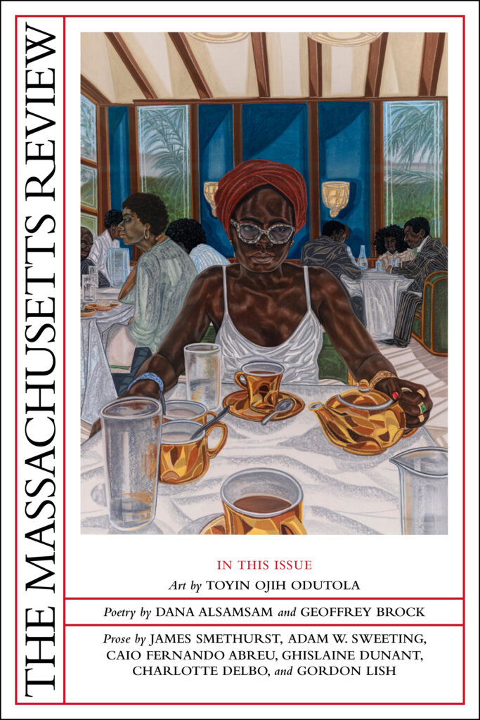 Thus some of what you will read here is what the Mass Review has always championed. Jim Smethurst’s disposition of the Amiri Baraka/Ralph Ellison debate takes sides in order to elevate the discussion, and thereby demonstrates how cultural studies happened here first—in Afro-Am, long before any Brits ever played the blues. No one should need reminding that category distinctions, including those between human and nonhuman animals, is what has always fed the fire of race hatred. The high art of Toyin Ojih Odutola leaves no room for any of that: blackbeing-there is the philosophical a priori of her work, her spaces inhabited with density and definition that cast no shadow and require no further illumination. A pair of poems by Teresa Cader, as well as an essay by Amanda Minervini, offer lessons we have forgotten and are therefore doomed to repeat: waking from such nightmares is surely the only cure for history.