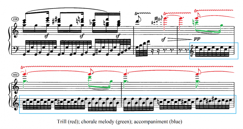Thus far, each variation has used successively smaller note values. Variation 6 arrives at the terminal point of this process: the right hand takes up a trill on a high G, its individual notes now so finely divided that they have no particular rhythmic value at all.[18] Under this trill the right hand just about etches out the chorale tune, while the left hand vibrates in thirty-second notes which gently abrade the trill above.