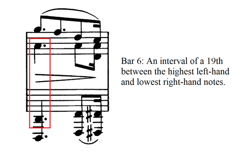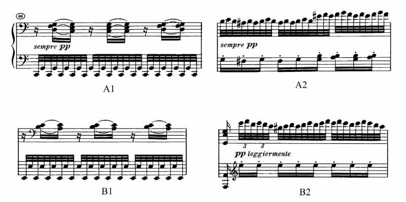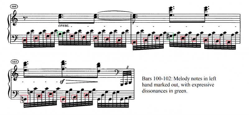 [7] People often describe the left-hand figuration here as if it’s a tremolo—a free oscillation between two notes—but it’s much more cunningly organised. The thirty-second notes in the left hand, as they alternate between C and G, are grouped into threes, with each group of three beginning alternately on a C/G. Three of these groups form each beat in the bar, and each of these beats also begins alternately on a C/G. And each bar, which contains three beats, also begins alternately on a C/G. Basically: the C/G oscillation has a fractal structure, self-similarity at different rhythmic scales. As a mathematical fact, this amounts to no more than the observation that no power of three is divisible by two, but as a textural feature, this gives the bass oscillation a kind of uncertainty and freedom you’d not find in an ordinary tremolo.