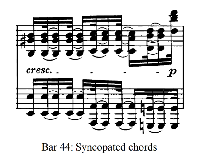 And, at the exact moment the music leaps back into C major from A minor, we’re served a full fat bar of syncopated chords, so that the music suddenly judders like a live nerve: