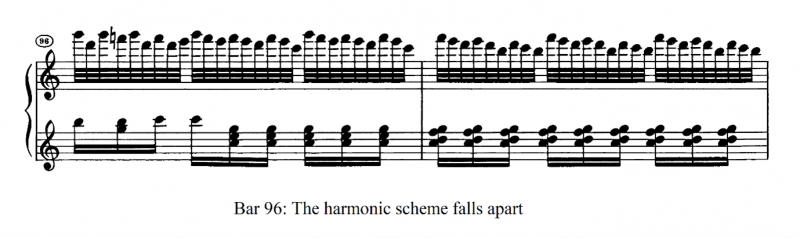 Something strange, even violent, happens here. Up to this point, every single bar of music has been derived strictly from the main theme. But at bar 96, almost unnoticeably, the music comes untethered from the underlying harmonic scheme:
