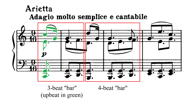 Although there is a fixed quality to this theme, an expressive reticence, it is not frozen: it isn’t the titanic, glacial mass of the Hammerklavier’s third movement, or even the sedate self-obsession of the Appassionata’s. There are small freedoms here. For one, the Arietta begins on an upbeat—a musical intake of breath that prepares for the proper entry of the theme—that is impossible to hear as an upbeat.[1] With the result that, instead of hearing one upbeat followed by two bars with three beats, you hear one bar with three beats, then an off-kilter bar with four beats, before the music returns to the correct three-beat pattern.[2]