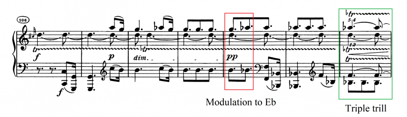 [14] Triple trills are rare in piano literature, but this is not the first time Beethoven uses one in a sonata. In the last movement of his Sonata No.3, he writes an absurd little supertonic trill that builds into a triple trill, refuses to resolve, and then slips (embarrassingly) into the wrong key altogether. In a similar way the supertonic trill here also leads into a modulation, although it is not at all funny.