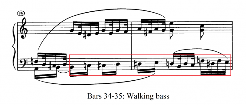 Variation 2 effectively doubles the perceived tempo by stuffing two swingy triplets into each beat, where the previous variation managed just one. The music takes on, slightly improbably, the character of a shuffle. At bar 34 we are treated to a walking bass: