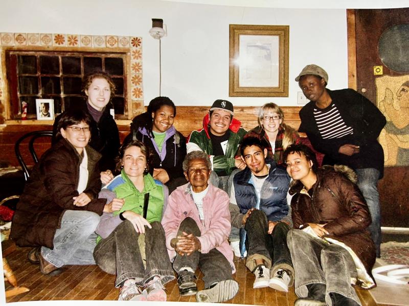 Juanita welcomed us to her cabin on a chilly fall afternoon. The cabin was as cozy as ever, with her desk still filled with correspondence, writing, and organizing projects. She offered us tea and pumpkin bread. As she talked of her work, the students listened, captivated and in awe they were meeting someone who had been involved in so much movement work, still going strong. When it came time to snap a photo, she sprang forward to sit in the front row on the floor.