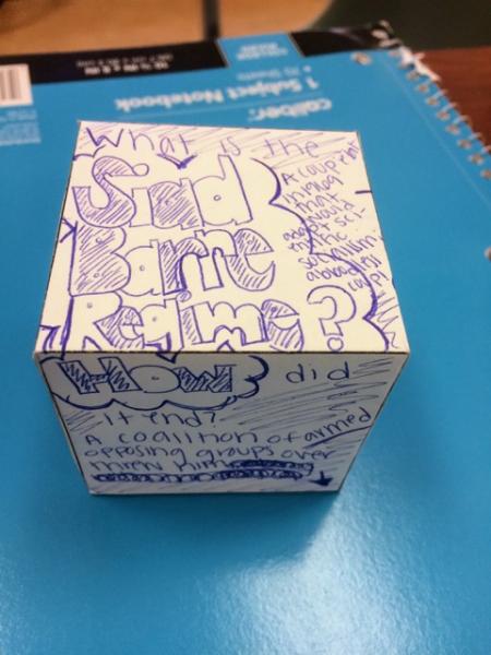 I had them transcribe their inquiries onto grids they could make into cubes, through the teen-enchanting processes of cutting, folding, and using tape or glue. Making a cube would let students process their dutiful notes into a handy, little-bit-different, perhaps more memorable, and easy-to-talk-about artifact. Early finishers made a giant map of the essay on the floor out in the hallway, bringing out-of-sight/out-of-mind places such as Mogudishu, Tripoli, and the treacherous Strait of Sicily into our own sunshine-y UCLA world.